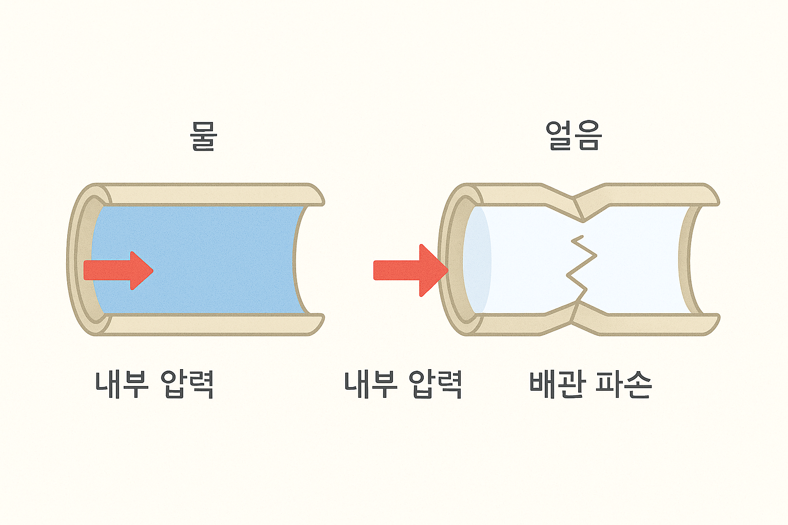배관 속의 물이 얼기 시작하면, 그 부피 팽창이 안쪽 벽을 강하게 밀어내기 때문이죠.