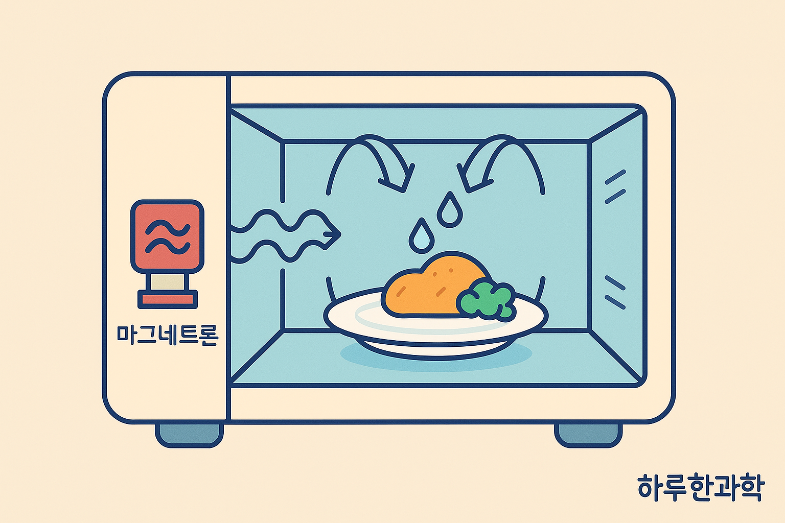 이 파동은 음식 속 물 분자를 빠르게 흔들어 마찰열을 만들고, 그 열이 음식 전체로 퍼지면서 데워지는 구조예요.